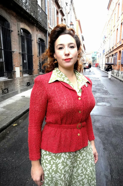 Voyez cette robe : vous l'avez déjà vue plusieurs fois dans ces pages. Sa fluidité, son tissu, sa coupe, en font un excellent basique que je peux assortir comme bon me semble. Si je l'ai portée la première fois jambes nues, accompagnée d'un beau chapeau de style chinois, vous l'avez vue ensuite avec des collants et une veste 40's noirs, puis assortie avec du bleu. Aujourd'hui, c'est avec des teintes plus chaudes que je l'ai mariée : non contente de pouvoir enfin ressortir mon cardigan favori, d'une belle couleur framboise clair, j'ai poussé l'expérience jusqu'au collants, bordeaux, avec mes chaussures fin 40's en cuir brun-roux. Côté bijoux ? Une impressionnante broche en lucite (?) sculptée et peinte (trouvée sur Etsy toujours : chez Preserve Cottage), et des boucles d'oreilles en bambou, années 40, extraites d'un stock d'époque acheté pour ma boutique.